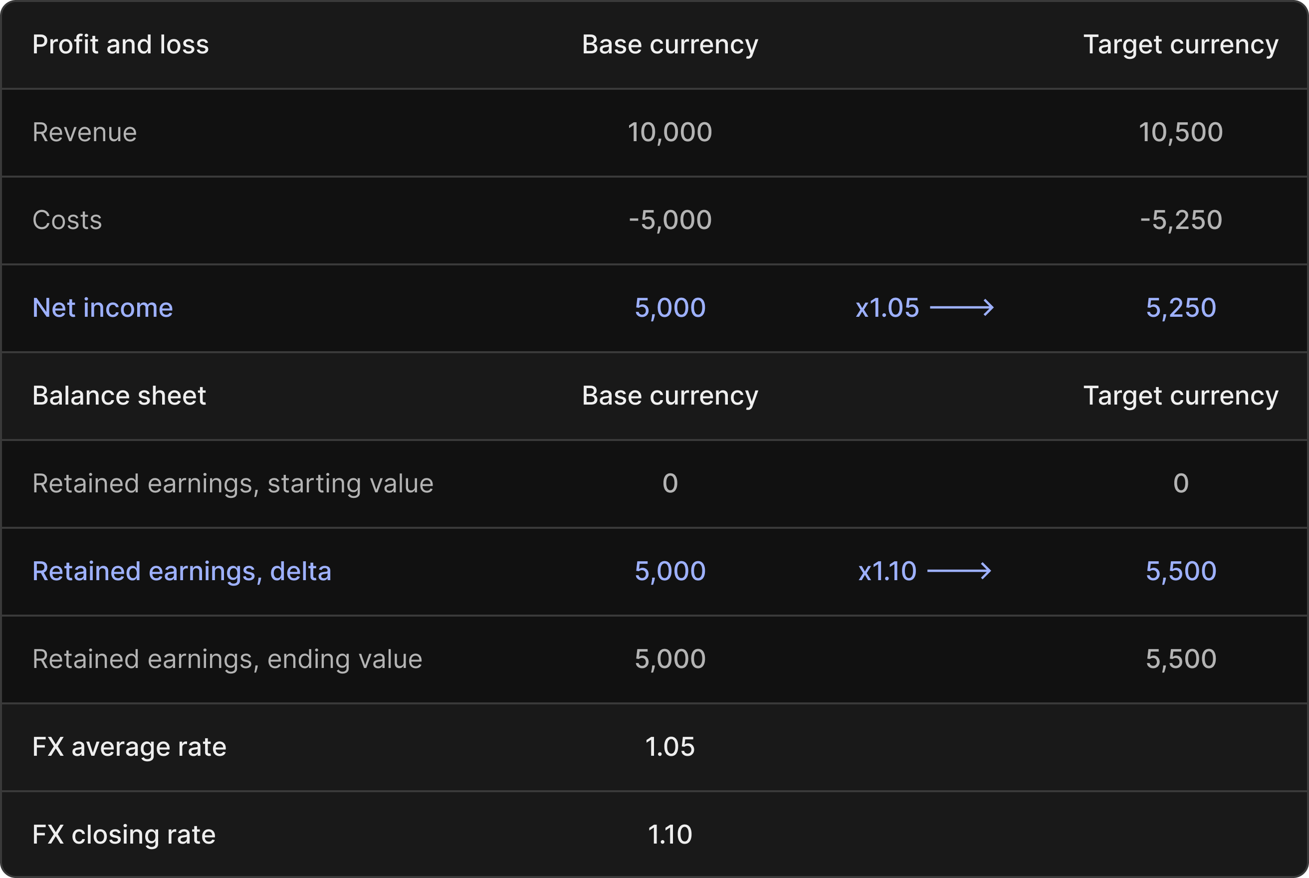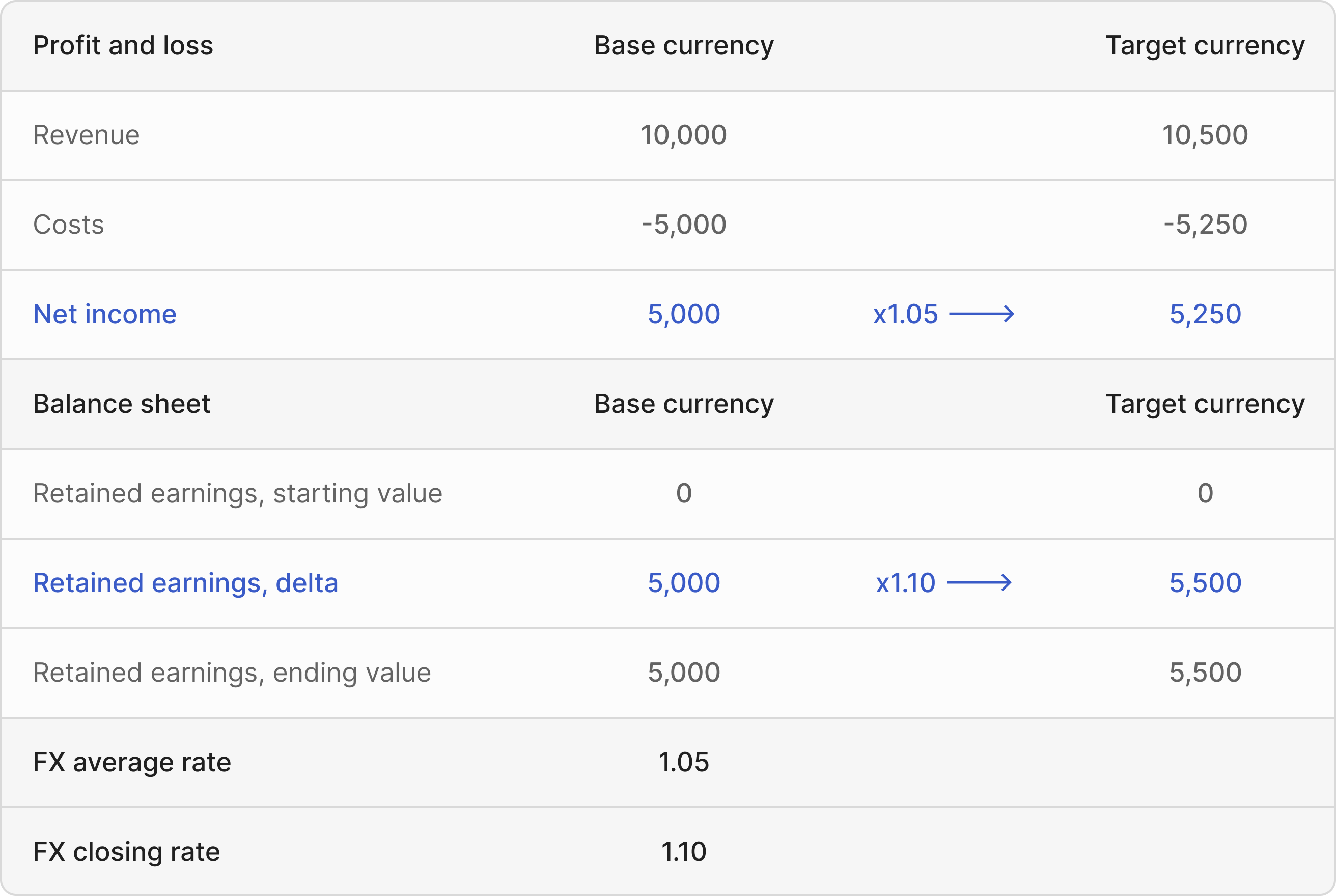 While P&L items are translated at average monthly rates, their corresponding balance sheet entries are translated at closing rates. As a result, the P&L and balance sheet may use slightly different exchange rates for the same underlying transactions. In the example below, we demonstrate how the difference between average and closing rates effects the equity account for retained earnings.