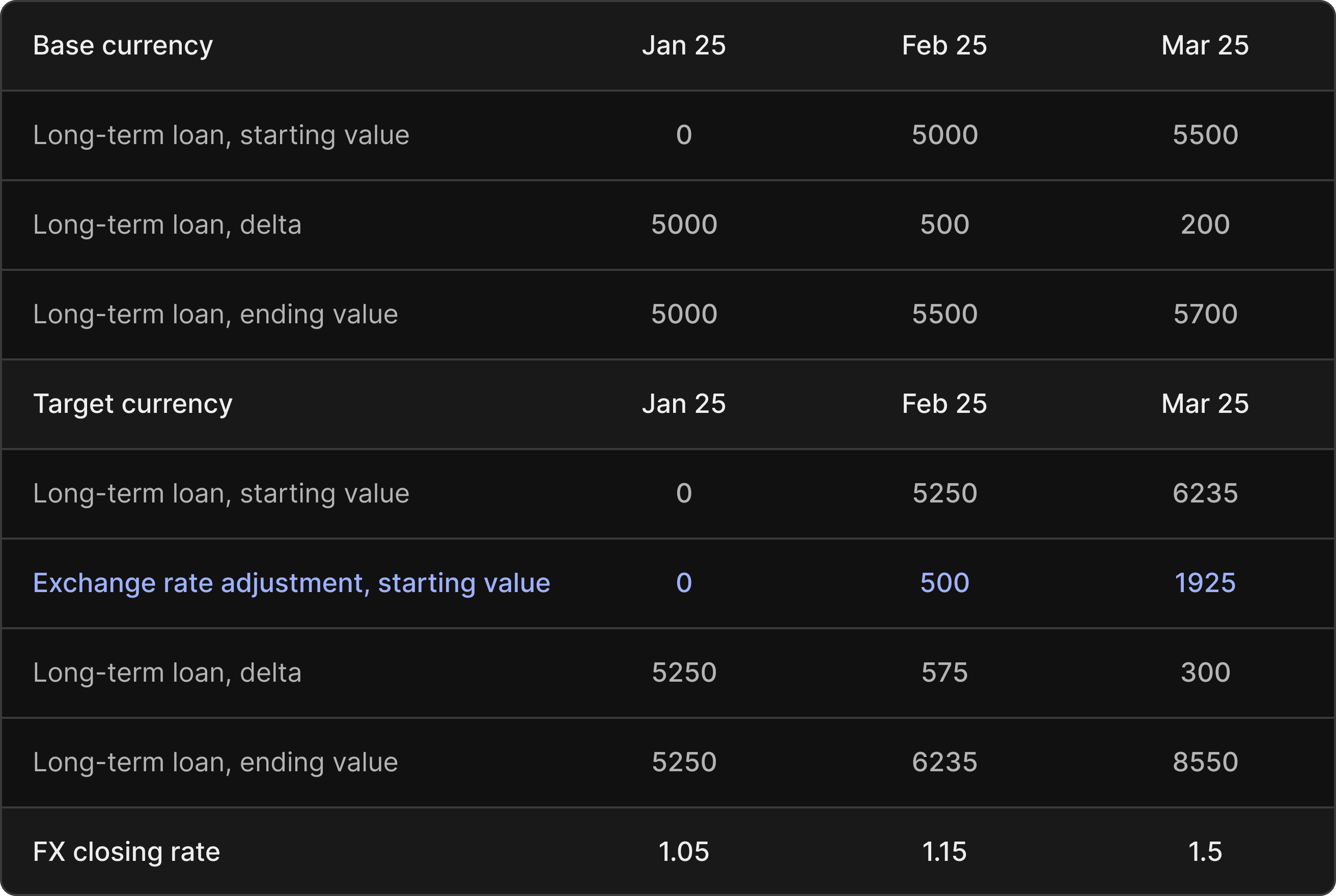 Opening balance sheet amounts are translated at the current month’s closing rate. This can cause balance sheet values to fluctuate due to exchange rate changes alone, even without new transactions. In practice, it means your balance sheet will reflect both financial movements and currency adjustments. In the example below, we demonstrate how to calculate the exchange rate effect resulting from fluctuating exchange rates.